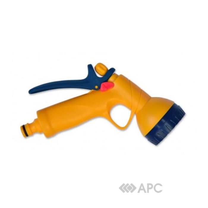 Пістолет-розпилювач встановлюється на шланг для поливу і здійснює зрошення рослин точним і делікатним способом. Корпус виробу виконаний з якісного ABS-пластику. Він оснащений ергономічною ручкою з фіксатором, що дозволяє здійснювати безперервний полив, і 6 режимами поливу: сильний струмінь, круг, душ, розпилення, вертикальний і плоский струмінь. Пістолет для поливу - це можливість контролювати рівень витрати води та поливати навіть найвіддаленіші куточки ділянки.