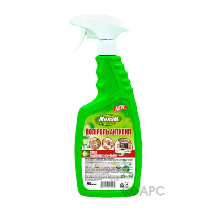 Поліроль для меблів МилаМ Chemical Антипил 750 мл відмінно справляється зі своєю основною задачею та став найкращим серед виробів у цій сфері. Відмінна формула повністю безпечна, тому не дасть шкідливого впливу на здоров’я. Спрей очистить поверхні будинку від пилу, створить захист надалі. Продукт економно використовується, тому банки об’ємом 750 мл вистачає на декілька місяців. Чистота, блиск та приємний аромат наповнять ваш будинок, а процес прибирання стане комфортнішим.