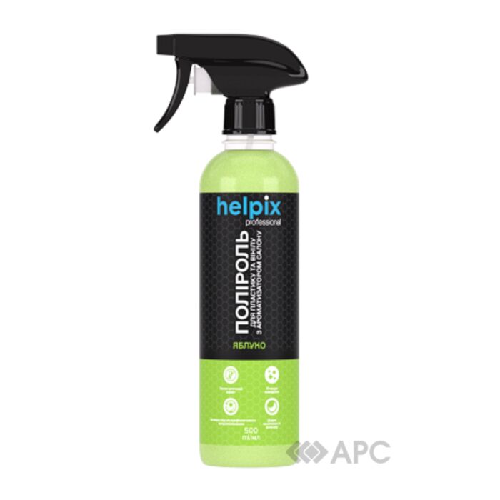 Поліроль для пластика й вінілу Helpix 500 мл захищає пластикову поверхню автомобіля від появи пилу або плям. Аромат: «Яблуко».