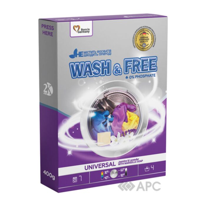 Пральний порошок Wash&Free з марсельським милом 400 г — це засіб від українського виробника, який призначений для ручного прання будь-якого одягу. Легко справляється із найважчими забрудненнями, зберігаючи високу якість речей. Активна формула не містить фосфатів та хлору, глибоко проникає у волокна тканини, виводить бруд назовні на молекулярному рівні. Засіб повністю розчиняється у воді та утворює помірну піну, що підсилює усі властивості цінних компонентів.
