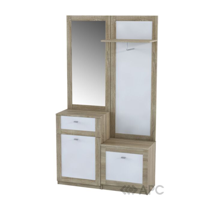 Компактний сучасний передпокій Malaga (Малага) від Аква Родос. Світла мебель в пастельних тонах, корпус і рамка фасаду в кольорі дуб Сонома, фасад - матовий молочний. Передпокій Malaga є блок з 4-х елементів: вертикального дзеркала, вішалки та 2-х тумб. Передпокій можна доповнити як 3-х дверною шафою Малага, так і будь-яким шафою купе в кольорі дуб Сонома