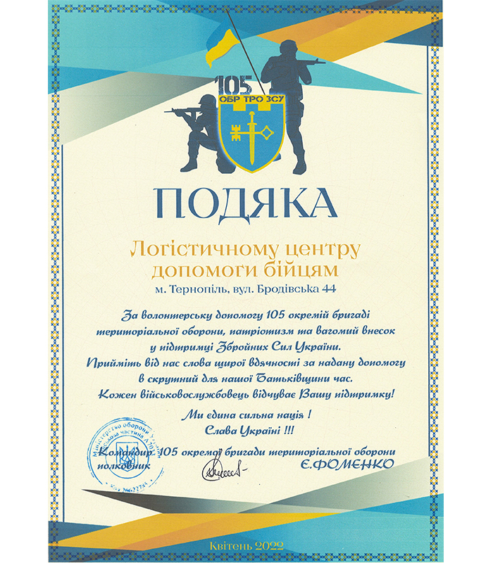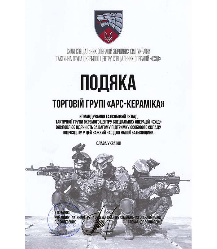 Дякуємо торговій групі за значний внесок у функціонування нашого центру. Ваша фінансова допомога сприяла реалізації ініціатив на підтримку діючих бійців амуніцією та військовим забезпеченням, що значно покращила комфорт та безпеку в зоні бойових дій. Продовжуючи співпрацю з компанієї АРС, ми віримо в подальший успіх майбутніх проєктів для Збройних Сил України.