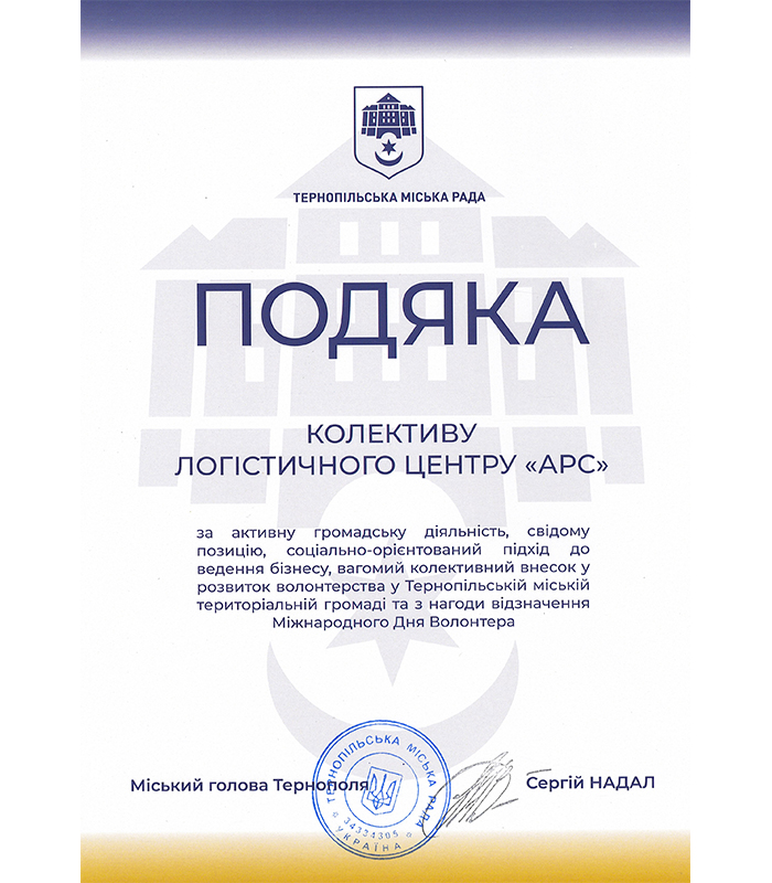 Висловлюємо щиру подяку компанії АРС за різносторонню допомогу, яку ви надаєте в умовах повномасштабного вторгнення. Ваша вагома підтримка благодійного фонду, яка охопила різні аспекти, включаючи фінансові, товарні та гуманітарні, дозволила нам подолати нестачу ресурсів і забезпечити необхідним людей, що опинились в скрутному становищі. Нам надзвичайно важливо мати такого надійного партнера, готового допомагати у найважчі моменти.