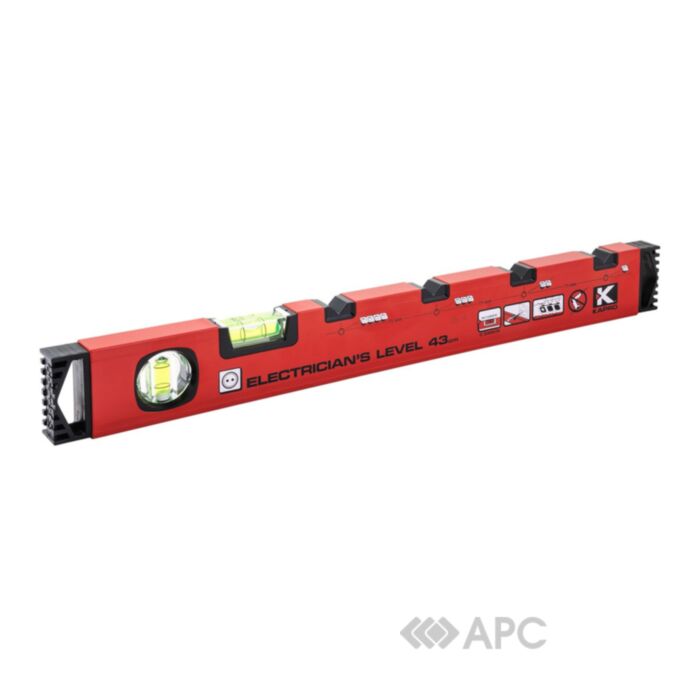 Рівень електрика, 430 мм/783-43 — міцний алюмінієвий коробчастий профіль, який допомагає виміряти точну відстань між розетками. Оснащений 4-ма маркерами, розташованими на відстані 71 мм один від одного. Укомплектований 2-ма монолітними акриловими колбами, які кріпляться епоксидною смолою.Торцеві ковпачки запобігають пошкодженням під час ударів.