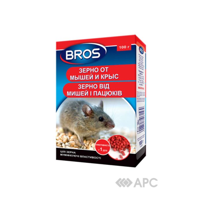 Родентицидний засіб Bros зерно від мишей і пацюків — дієва та доступна отрута актикоагулянтної дії. Приманка у вигляді цілих зерен надзвичайно ефективна, має накопичувальний ефект та муміфікуючі властивості, що перешкоджають поширенню неприємного запаху після гибелі гризунів. Смерть шкідників наступає досить швидко, максимальний ефект спостерігається через 7-10 днів після початку застосування препарату. Продукція польського виробника користується неабиякою популярністю на українському ринку завдяки високій якості та низькій вартості.