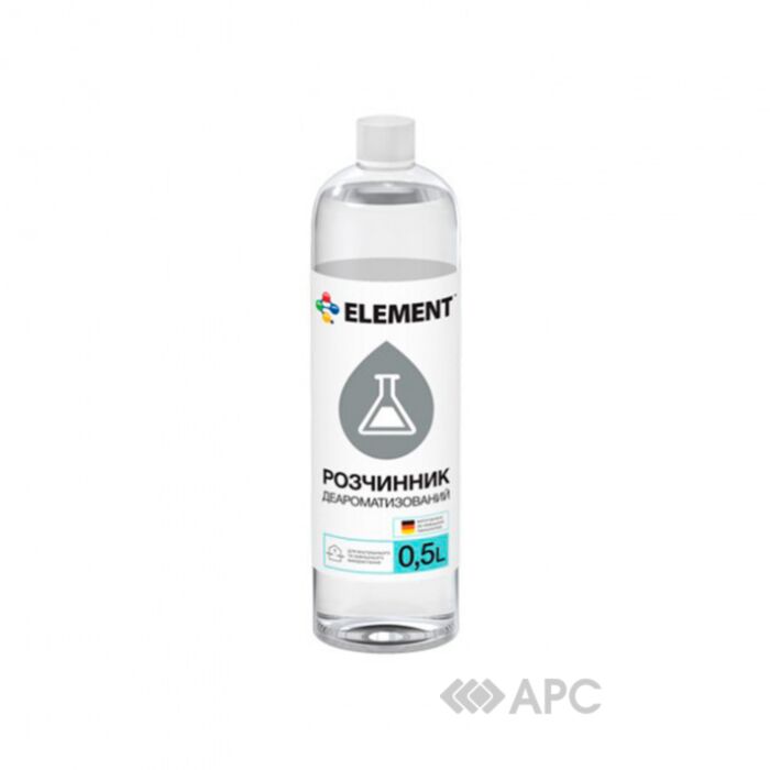 Розчинник деароматизований Element призначений для розведення до потрібної консистенції алкідних і масляних фарб, емалей, грунтовок, оліфи та інших матеріалів. Також використовується для очищення інструментів, основ під фарбування та лакування. Має властивість знежирювати поверхні. Засіб придатний для проведення внутрішніх та зовнішніх робіт. Розчинник Element екологічно безпечний, без специфічного запаху.