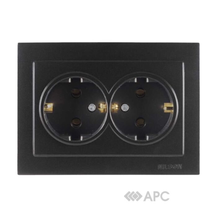Розетка подвійна із заземленням Nilson чорна з серії Touran оснащена латунними контактами і зроблена з термостійкого і самозагасаючого пластику. Вона має класичний дизайн і підійде для будь-якого інтер'єру. Завдяки наявності заземлення виріб відповідає всім нормам безпеки і захищає користувача від удару електричним струмом.