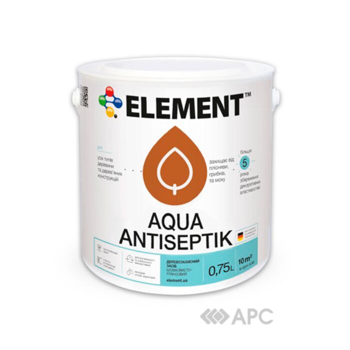Препарат Element Aqua Antiseptik защитит древесину от грибка, мхов и плесени; добавит стойкости к воздействию атмосферных факторов, придаст грязеотталкивающих свойств; не оставит пятен и разводов, подчеркнет текстуру древесины. Состав стойкий к воздействию механического характера. Приблизительный расход 1 л препарата приходится на 13 м². Element Aqua Antiseptik стойкий к УФ-воздействию, дает долговечный эффект. Используется для внутренних и внешних работ.