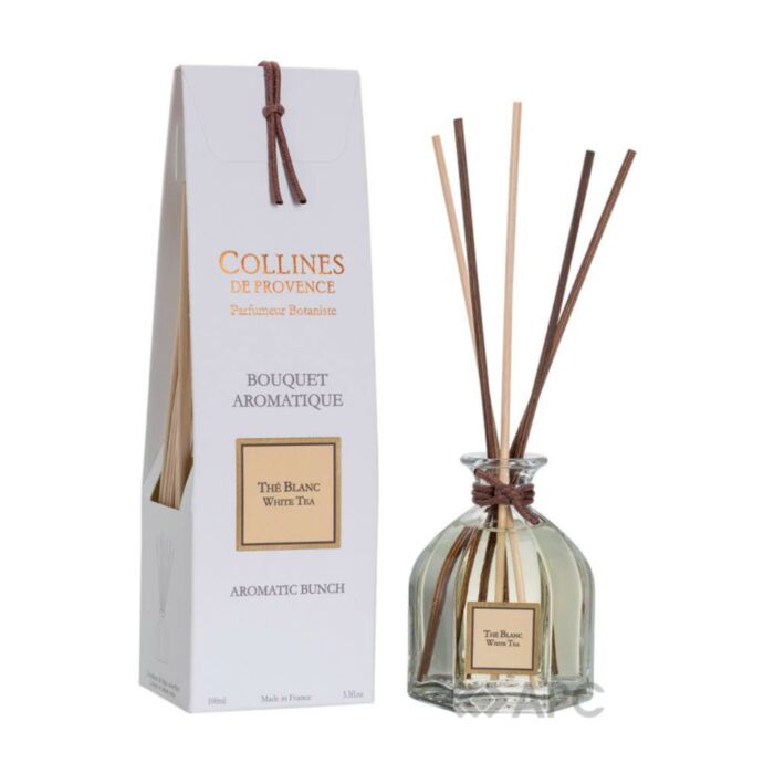 Аромадифузор Collines de Provence Белый чай C0101TBL 100 мл – это невероятный микс свежих цитрусовых ароматов. Стильный стеклянный аромадифузор с ротанговыми палочками наполнит ваш дом приятным запахом, интенсивность которого можно регулировать, изменив количество палочек во флаконе. Такой элемент декора выглядит изысканно и эстетически привлекательно.
