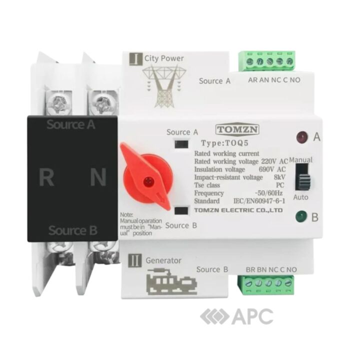 Автомат ввода резерва АВР Tomzn TOQ5-2/125A - обеспечивает бесперебойное электроснабжение потребителей, автоматически или вручную переключаясь на резервные источники питания в случае перебоев основного снабжения. Однофазный выключатель-разъединитель поддерживает номинальное напряжение 400 В и ток до 125 А, благодаря чему является оптимальным вариантом для бытового и коммерческого применения.