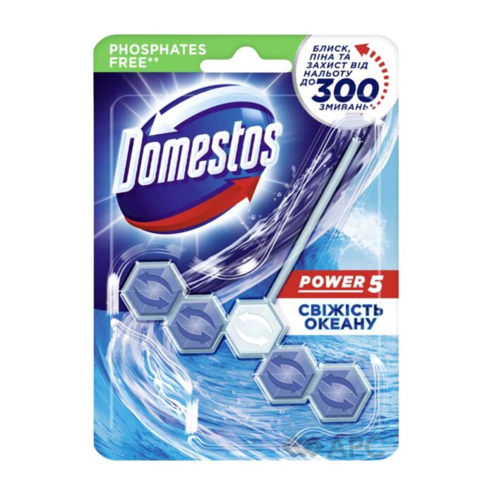 Блок для унитаза Domestos Ocean Power 5 55 г - простое в использовании и действенное средство для нейтрализации неприятных запахов, дезинфекции, длительного сохранения чистоты в туалете. Легко очищает от загрязнений и известнякового налета даже в труднодоступных местах. Активная пена окрашивает воду, обладает легким ароматом, защищает поверхность от патогенной флоры (бактерий и микробов).