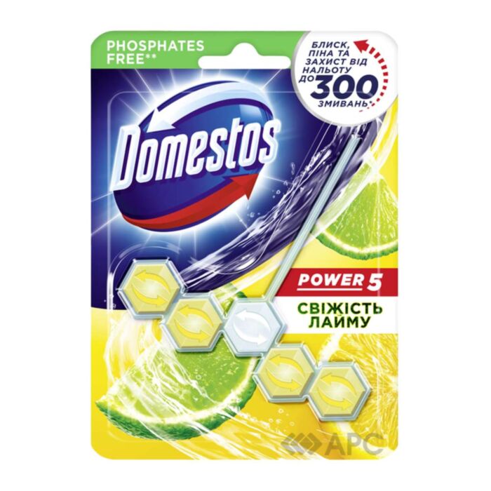 Блок для унитаза Domestos Power 5 Свежесть лайма 55 г - простое в использовании и действенное средство для нейтрализации неприятных запахов, дезинфекции, длительного сохранения чистоты в туалете. Легко очищает от загрязнений и известнякового налета даже в труднодоступных местах. Активная пена окрашивает воду, обладает легким ароматом, защищает поверхность от патогенной флоры (бактерий и микробов).