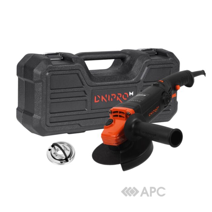 Угловая шлифовальная машина Dnipro-M GL-125S идет в комплекте с кейсом и гайкой.