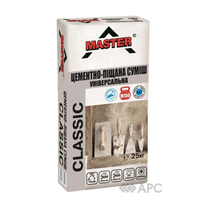 Цементно-песчаная смесь Master Классик 25 кг - цементно-песчаный состав, модифицированный полимерными добавками, который можно использовать для кладки, штукатурки и стяжки снаружи и внутри здания. Делать стяжки рекомендовано на прочных основах, которые не склонны к деформированию.