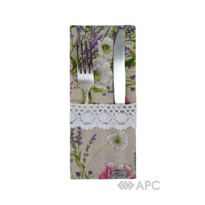 Чехол для столовых приборов Прованс — это классический конверт украинского производства, предназначенный для сервировки стола, в него можно положить вилку, нож или ложку. Прямоугольной формы, имеет 2 отдела. Изготовлен из качественной испанской ткани, в состав которой входит 80% хлопка и 20% полиэстера, с цветочным дизайном, светло-бежевого оттенка. Кармашки украшены кружевом, имеют идеальные швы. Не рекомендуется отбеливать и не подлежит химической очистке. Размеры изделия 24х10 см.