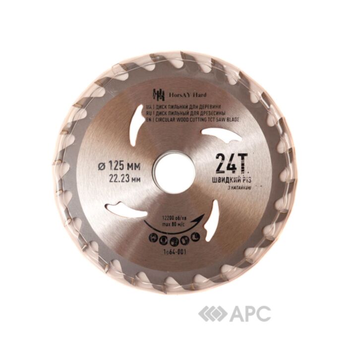 Диск пильный HorsAY Hard 1664-001 по дереву имеет наружный диаметр 125 мм, посадочный диаметр 22 мм и 24 зубца. Диск пильный необходим расходник при работе с циркулярными пилами и станками. Используется для распила мягких и жестких пород древесины, фанеры, деревянных панелей и схожих материалов. При выборе пильных дисков следует обратить внимание на следующие параметры: общий диаметр, посадочный диаметр, толщина и количество зубцов, тип диска (монолитный для мягких пород дерева или твердосплавный для твердых пород). Представленная модель обеспечит надежный, качественный и быстрый рез по дереву.