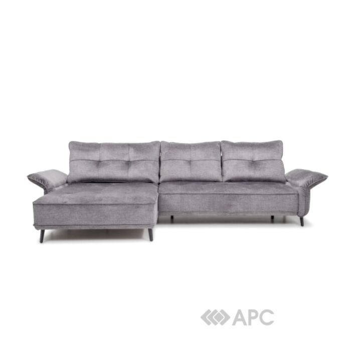 Диван оснащен нишей для белья, расположенной в угловой части, что обеспечивает дополнительное место для хранения и делает его не только стильным, но и функциональным элементом интерьера. Для максимального комфорта предусмотрена возможность регулировки положения подлокотников. Подушки, наполненные холлофайбером и с чехлами с прослойкой поролона, крепятся к спинке с помощью змейки. Высокие металлические ножки придают визуальной легкости и способствуют увеличению пространства. Задняя спинка полностью обтянута тканью.