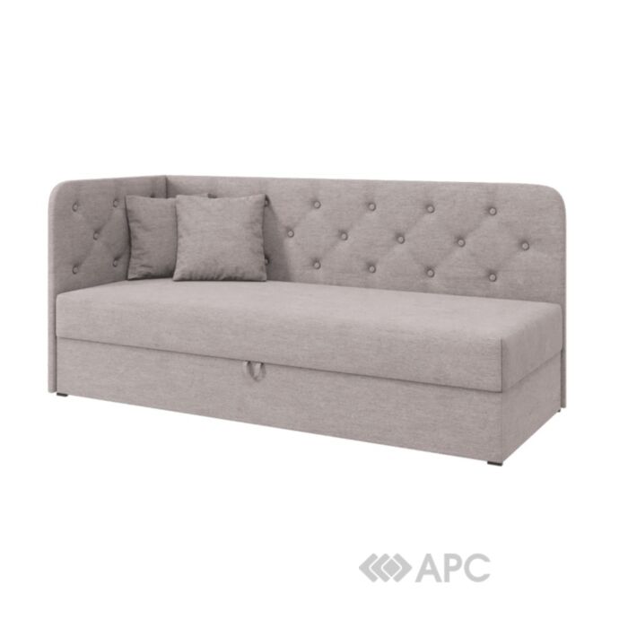 Диван оснащен вместительным коробом для белья, что позволяет организованно хранить постель и другие вещи, оптимизируя пространство. В комплектацию входят две подушки, выполненные в тон основной обивки, завершающие эстетический вид изделия. Визуально, диван отличается элегантным высоким изголовьем и боковой спинкой, украшенными каретной стяжкой, что придает ему особый шарм и изысканность. Эта модель предлагает не только комфортный отдых, но и элегантное решение для вашего пространства.