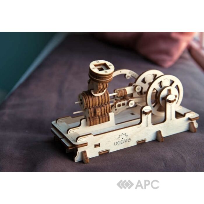 • Пневматический двигатель UGEARS небольшой, но точный аналог паровых машин. Чтобы он заработал достаточно подуть в специальный раструб или же запустить двигатель от обычного воздушного шарика. Необычно то, что модель выполнена полностью из древесных материалов. Конструкция имеет воздушный тахометр и два пенала для мелочей.