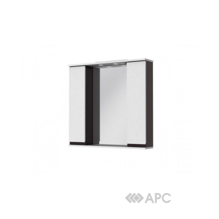 Настенный зеркальный шкаф шириной 100 и высотой 87 см. В конструкцию зеркального шкафа входят два врезных светильника, выключатель и розетка. Влагостойкое зеркало, кромка по периметру.