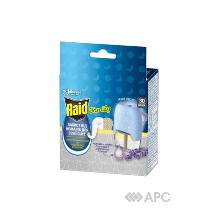 Электрофумигатор от комаров Raid 30 ночей с приятным ароматом лаванды и натуральными эфирными маслами представлен в формате удобного и компактного устройства и сменного флакона с жидкостью. Инсектицид, испаряясь, уничтожает насекомых, воздействуя непосредственно на нервную систему. Эффект заметен через 8-10 минут после включения. Состав нетоксичен, безопасен для всей семьи. Прибор имеет оригинальный дизайн, после присоединения к электросети излучает мягкое свечение. Средство получило широкую популярность среди украинских потребителей, поскольку гарантирует спокойный и крепкий сон без надоедливого жужжания. Производитель рекомендует внимательно ознакомиться с инструкцией перед использованием и соблюдать меры предосторожности, указанные на упаковке.