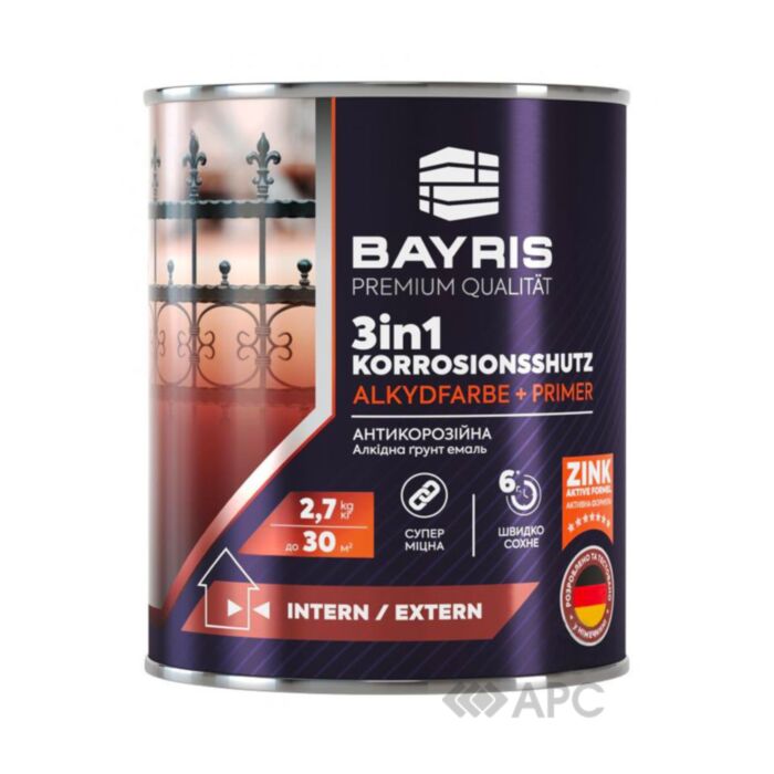 Эмаль алкидная Bayris 3 в 1 зеленая 2,7 кг - высококачественный антикоррозийный грунт-эмаль, разработанный для окрашивания металлических поверхностей, таких как сталь, чугун и железо, находящихся как под открытым небом, так и внутри помещения.
