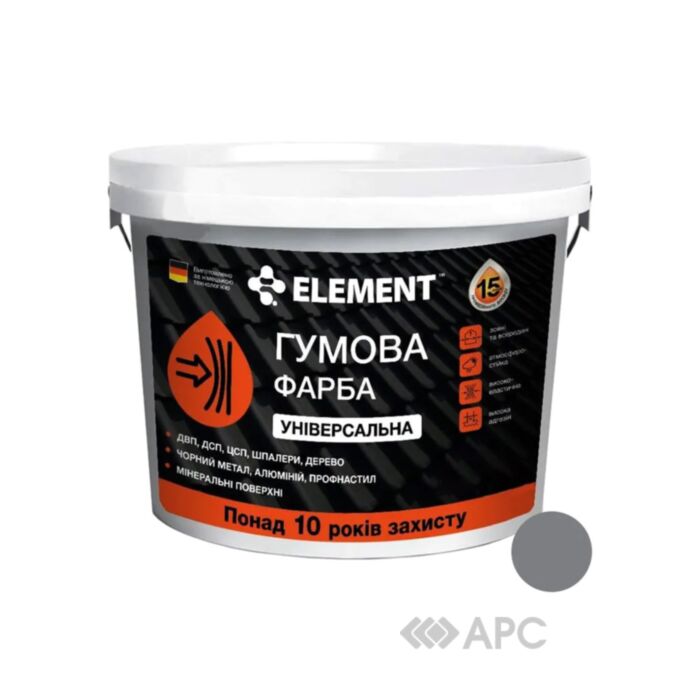Краска резиновая универсальная Element серая - это акриловое покрытие с новой формулой, которое обеспечивает высокий уровень адгезии к различным поверхностям, включая минеральные, металлические, деревянные и деревоподобные материалы. Благодаря специальной дисперсии, она обладает чрезвычайной эластичностью, устойчивостью к трещинам и влагостойкостью, что позволяет использовать ее для широкого спектра работ, таких как покраска кровель, ограждений, цоколей и стен. Легко наносится, не имеет запаха, не содержит органических растворителей и является экологически безопасной.