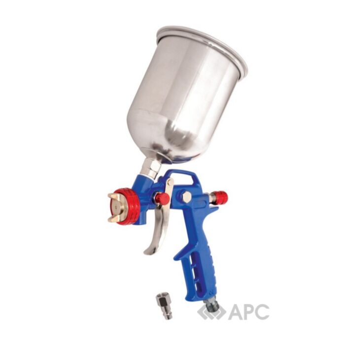 Краскопульт пневматический Mastertool 81-8719 - инструмент для быстрого и равномерного нанесения лакокрасочных смесей на различные материалы: дерево, металл, пластик и другие. Преимуществом устройства является возможность за короткий период времени обработать большие поверхности. Питание данной модели осуществляется с помощью компрессора. Алюминиевый резервуар находится сверху, что дает возможность работать с вязкими материалами, которые будут поступать к пистолету под собственным весом. Прибор оборудован переходником на 1/4", регуляторами формы факела, подачи воздуха и подачи краски.