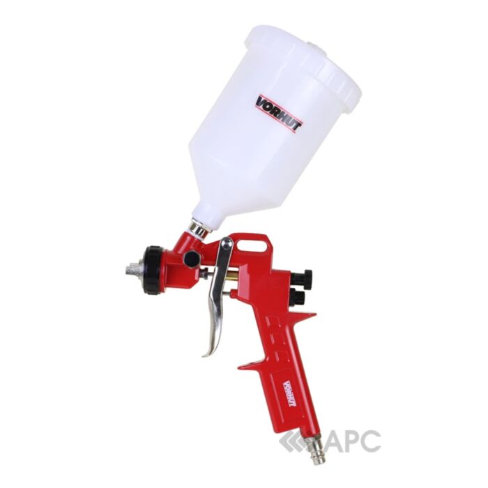 Краскопульт пневматический Vorhut 34-400 HP 1,4 мм 600 мл - инструмент для быстрого и равномерного нанесения лакокрасочных смесей на различные материалы: дерево, металл, пластик и другие. Преимуществом устройства является возможность за короткий период времени обработать большие поверхности. Питание данной модели осуществляется с помощью компрессора. Пластиковый резервуар находится сверху, что дает возможность работать с вязкими материалами, которые будут поступать к пистолету под собственным весом. Прибор оборудован переходником на 1/4", регуляторами формы факела, подачи воздуха и подачи краски.
