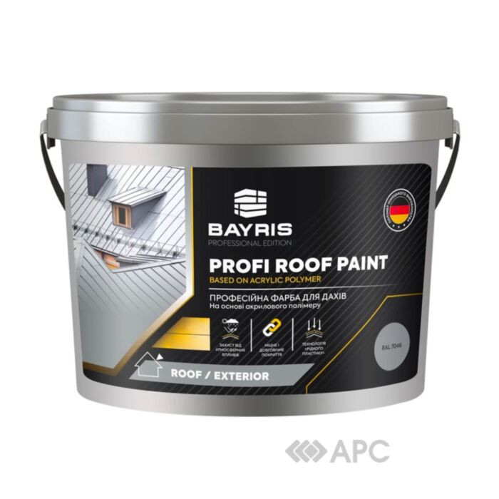 Фасадная краска акриловая Bayris Profi Roof Paint матовая серая 5 кг — это профессиональный строительный материал, который используется для декорирования и защиты крыш из оцинкованного металла, черепицы и шифера. Также покрытие подходит для отделки фасадов, заборов, цоколей, кирпичных кладок, природного камня, древесины и других оснований. Средство требует тщательной подготовки и осуществляется согласно государственным стандартам Украины. Полученное покрытие характеризуется матовостью, мелкозернистостью, средней толщиной сухой пленки и высоким водоотталкиванием. Краска обеспечивает устойчивое к интенсивной мойке покрытие и предотвращает коррозию на металлических поверхностях.