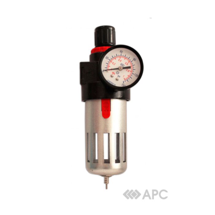 Фильтр-редуктор с манометром Forte FRM-14 предназначен для очистки сжатого воздуха от конденсата и мелких частиц Металлический корпус защищает колбу фильтра