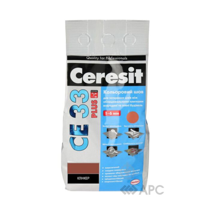 Фуга Ceresit CE 33 Plus 134 2кг - цементная смесь цвета клинкера с минеральными наполнителями и полимерными добавками с широкой сферой применения. Используется для затирки швов между облицовочными плитками (керамика, стекло, искусственный и натуральный камень) внутри и снаружи здания.