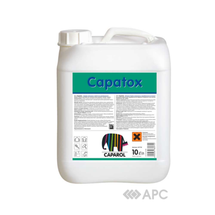 Водный раствор Микробиоциды (средство для уничтожения вредителей) для очистки от поражения водорослями и грибками на внешних и внутренних поверхностях, перед последующим нанесением покрытий. Capatox является раствором, готовым к нанесению.