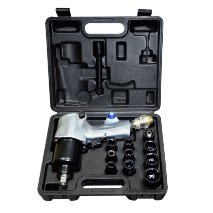 Комплектуется головками 9мм,10мм,11мм,13мм, 14мм,17мм,19мм,22мм,24мм,27мм, удлинителем, шестигранным ключем, лубрикатором, минимасленкой, переходником с наружной резьбой.