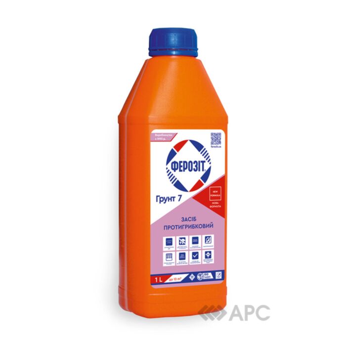 Ферозит Грунт 7 - противогрибковое средство для профилактики и устранения плесневых грибков, водорослей, лишайников, бактерий и дрожжей из штукатурки, каменных и бетонных поверхностей, крыш, покрытия из красок. При добавлении к штукатурным растворам повышается их устойчивость к действию микроорганизмов. Для наружных и внутренних работ. Поверхность, пораженную микроорганизмами, очистить и тщательно промыть водой. Ферозит Грунт 7 выпускается в виде раствора, готового к применению. Противогрибковое средство наносить на сухую подготовленную основу с помощью щетки тонким равномерным слоем. При наличии постоянного подмокание эффективность средства может снижаться.Час высыхания 2-3 часа при температуре окружающей среды +20 и относительной влажности воздуха 60%. Работы выполнять при температуре от + 5 ° С до + 30 ° С.
