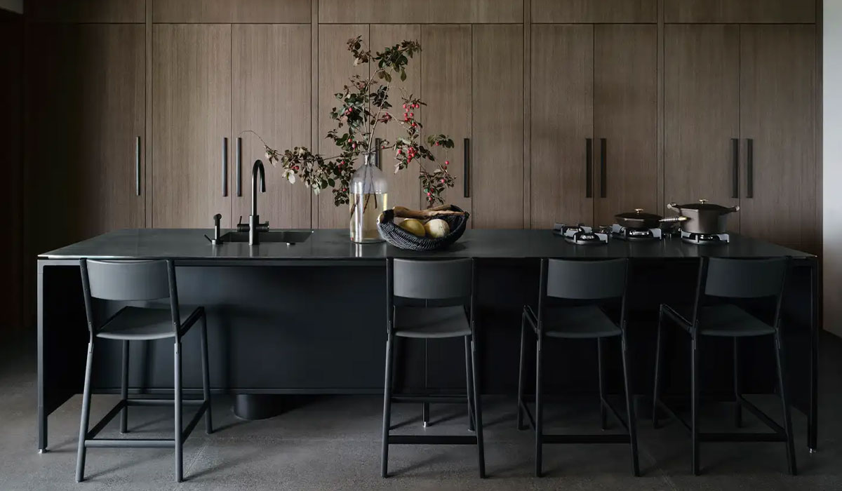 Интерьер кухни Atem Quarzo воплощает концепцию современного монолитного пространства, где ключевую роль играет длинная черная столешница, бесшовно объединяющая рабочую и обеденную зоны. Такое решение создает непрерывную горизонтальную линию, которая визуально удлиняет помещение и обеспечивает максимальную функциональность. В рабочую часть столешницы интегрирована мойка Adamant Univer в глубоком оттенке антрацит, практически сливающаяся с поверхностью, создавая эффект целостности. Ее дополняет смеситель KFA Armatura Neda black, изящный черный силуэт которого подчеркивает графичность интерьера и соответствует последним трендам минимализма. На контрасте с темной рабочей поверхностью выступает пол, облицованный крупноформатным керамогранитом Атем Quarzo GRM rect размером 60*120 см. Серый цвет плитки с текстурой природного камня уравновешивает насыщенность черных элементов, добавляя пространству света и визуальной легкости. Практичность кухни подчеркивается качественной посудой, такой как компактная сковорода Ringel Riegel, которая благодаря своему современному виду гармонично вписывается в открытое пространство. На обеденной части столешницы, плавно переходящей в стол, размещена декоративная ветка Bonadi с красными ягодами. Этот яркий органичный акцент длиной 85 см мгновенно оживляет монохромную палитру, добавляя кухне праздничного настроения и уюта.