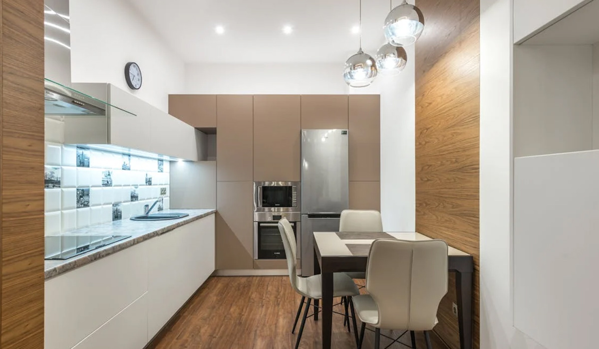 Интерьер кухни выполнен в современном стиле с акцентом на натуральные и природные оттенки, что создает уютную и элегантную атмосферу. Основу пространства составляет пол, выложенный керамогранитом Cersanit Wood Royalwood Brown (18,5*59,8 см). Коричневый оттенок с имитацией текстуры древесины добавляет натуральности. Между полом и стенами установлен коричневый плинтус MARCO decor SPC 7915-122 (79*2900 мм). Он гармонично сочетается с керамогранитом на полу, подчеркивая общий стиль и придавая ему завершенный вид. В обеденной зоне стена отделана плиткой Opoczno Love You Navy Wood satin (29*89 см). Сатиновая поверхность создает мягкий отблеск, добавляя текстурности и изящества помещению, а темно-бежевый цвет придает глубину и контраст, подчеркивая этот угол. В столешницу вмонтирована кухонная мойка Adamant Ellipsis (76,5*49,5*20 см) черного-металлического цвета. Вместе с ней установлен смеситель JIKA Olymp Deep 3.511U.1.004.230, что гармонично сочетается с ее дизайном. Комплект мойки и смесителя придает кухне современный и элегантный вид, а черный-металлический цвет добавляет нотку изысканности. На потолке видим множество точечных светильников Ultralight TRL315 51779 GU10 белого цвета. Они равномерно освещают все пространство кухни, обеспечивая достаточное освещение для рабочей зоны. Белый цвет светильников придает пространству легкость и не отвлекает внимание от основных элементов интерьера.