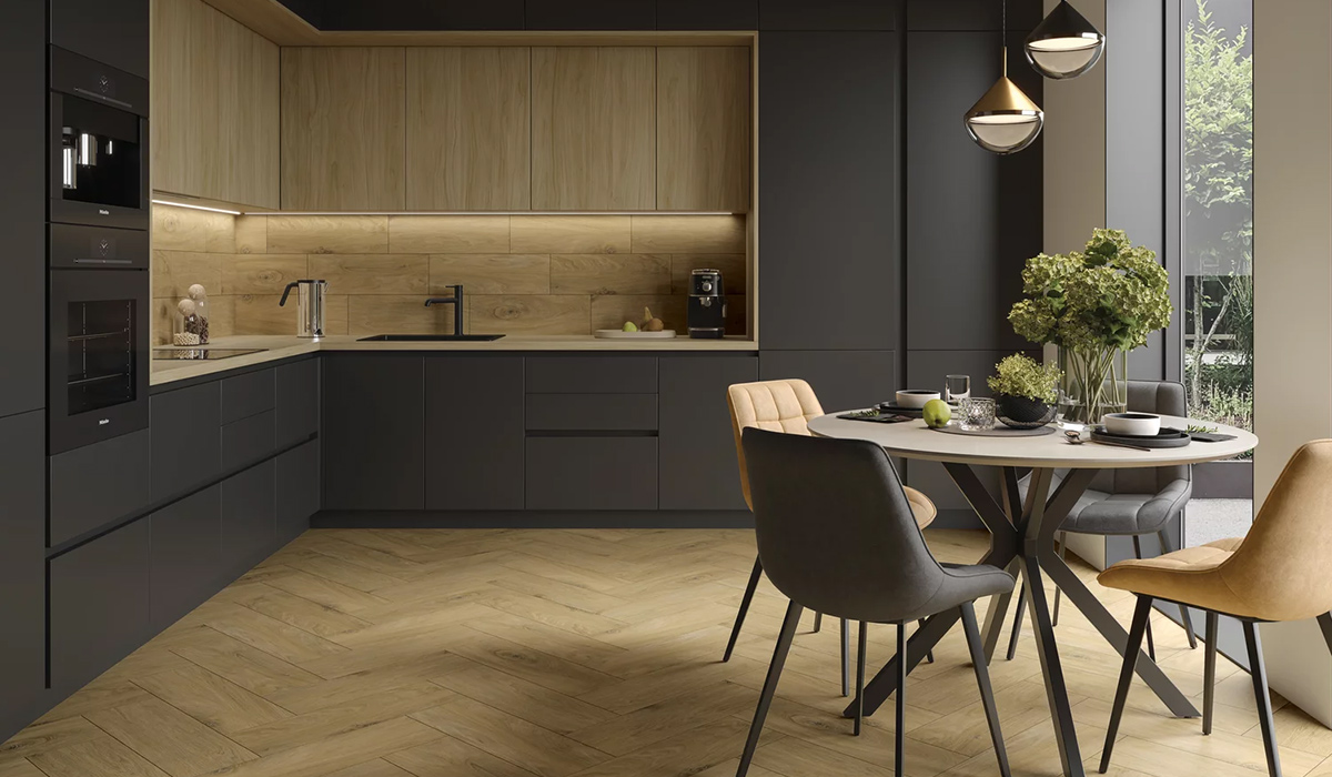 Превосходное естественное освещение кухни позволяет использовать черный цвет в качестве базового в сочетании с теплыми оттенками карамельного. Деревянная структура керамогранита TEO Ceramics Ecowood Honey F PR NR Mat 15*60 см бежевый добавляет света и изысканности комнате. Стол обеденный Signal Ritmo дуб/черный разместился у окна, где уют кухни граничит с гармонией сада. Ваза Lefard 804-006 30*19 см вмещает эффектную композицию из гортензий, а салатник Luminarc Diwali Granit P9204 12 см дополняет эстетику черной посуды. Стул обеденный Richman Альба Ю Жасмин 29 серый и стул обеденный Richman Альба желтый повторяют сочетание цветов мебели и отделки. Кухонная мойка Adamant Anila Plus 03 77,5*49,5 см черная добавляет удобства в пользовании и выдерживает основную гамму цветов. Интерьер выглядит драматично и таинственно одновременно благодаря удачному освещению.