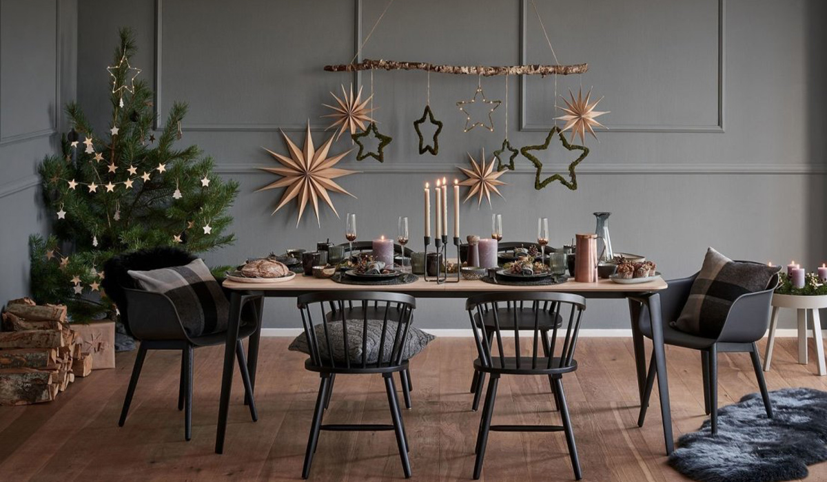 Графитовая комната, украшенная к праздникам, сочетает простоту решений и гармонию натурального декора. Пол естественного цвета, что обеспечивает ламинат Kronospan Super Natural Classic K057 Дуб Клирвотер 4V 8 мм, смягчает холодный оттенок стен и дарит атмосферу домашнего тепла. Праздничный стол сервирован к приходу гостей, его дополняют стулья обеденные металлические Richman Либерти Ю Хилтон 04 черного цвета. Сбоку маленький столик кофейный Merx Moderno МН580 белый 26008987, задекорированный мхом и свечами, творит волшебный уголок живой природы. На столе видим порционные тарелки Limited Edition Sandy Grey ZH-7016-1 26,5 см на салфетках сервировочных Olens Плетенка DL-N13-3 38 см черная и стаканы Versailles Турмалин VS-T260TD 260 мл дымчатые. Сияют прозрачностью стекла бокалы для шампанского Olens Розовое золото AT10239 250 мл. Бумажные звезды и растительные композиции создают волшебную гармонию эко стиля.
