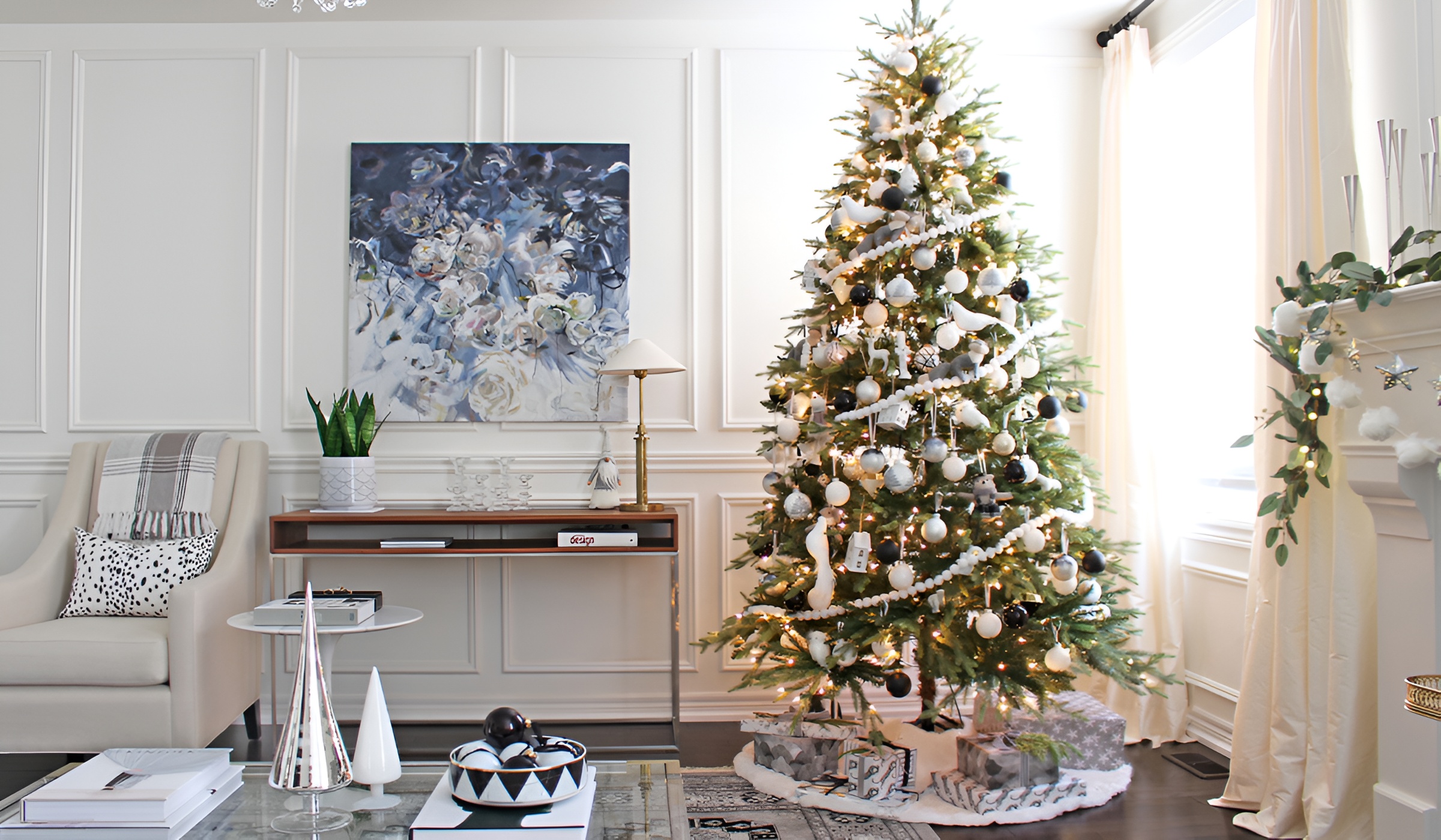 Приглашаем в гостиную, где черно-белая палитра уже не знаменуется строгостью и сдержанностью, а наоборот – создает торжественную и радостную атмосферу новогодних праздников. Здесь белоснежная легкость интерьера как будто опирается на прочную основу темного пола, отделанного ламинатом Kronopol Parfe Floor 4075 Дуб темный 32 класс 4V 8 мм. Белые поверхности удачно дополнены прозрачностью столика журнального стеклянного Саммит 13 серый и элегантных подсвечников Bohemia Luxor 9K755-99083 21 см на полке. Главным дирижером праздничного настроения является стройная елка Венская литая 250 см, украшенная белыми птицами, домиками, оленями. В гармоничную композицию сочетаются игрушки на елку шары Dashuri 8 см глянцевые белые и шары Dashuri 8 см черные. На большой каминной полке выстроились элегантные серебристые подсвечники Elisey Ореол 9137-007 22 см, придающие волшебный шарм и изысканность очаровательному спокойствию комнаты.