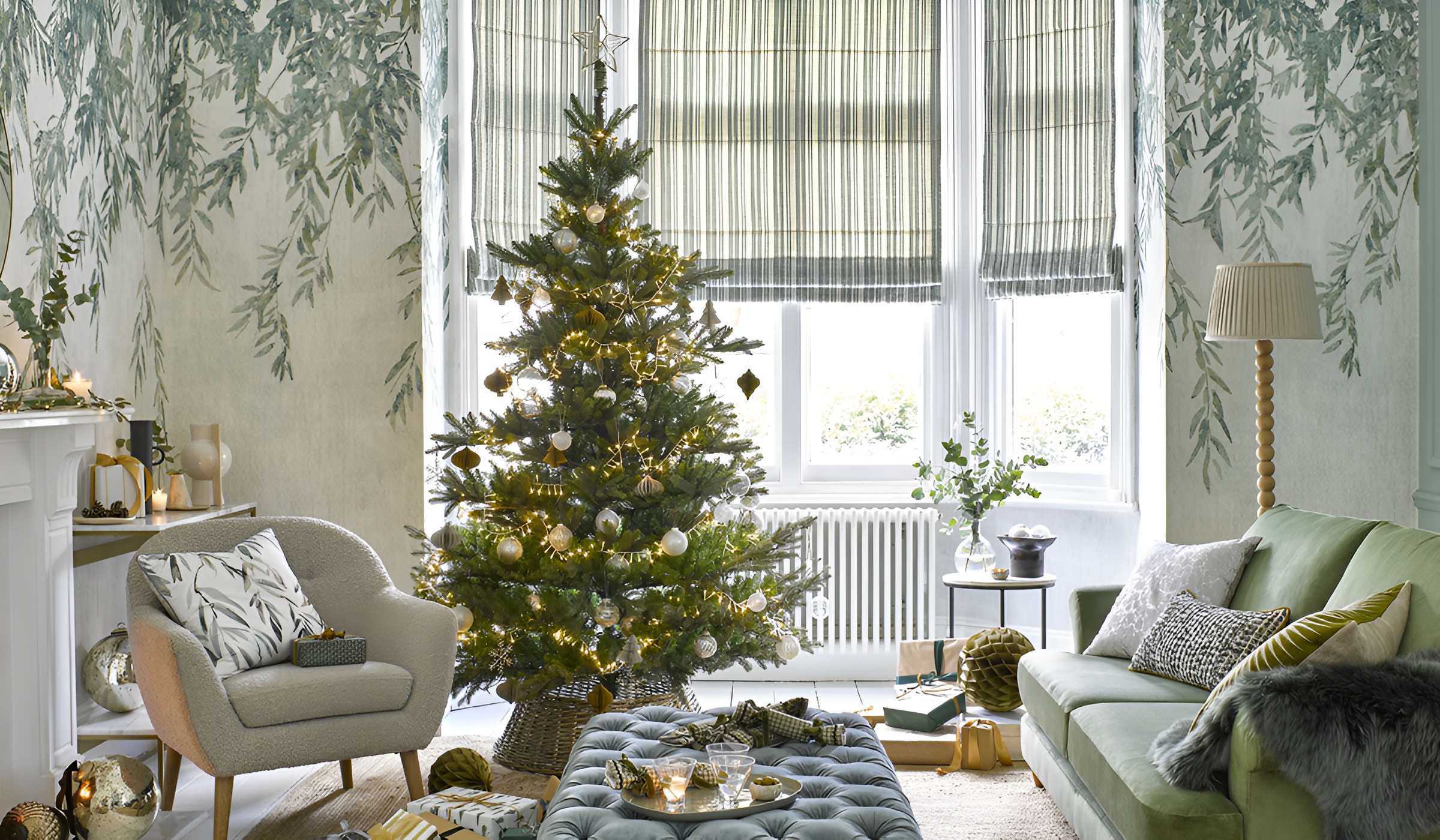Растительные мотивы оливковой гостиной гармонично сочетаются с изумрудным настроением новогоднего декора. Листья на стенах, ветки в вазах, полосатые шторы и бумажные шарики оригами цвета хаки вырисовывают естественную палитру оттенков зеленого. Элегантный диван Лино оливковый украшен мягкими подушками разных фактур и размеров. Здесь приятно отдохнуть после утомительного дня, согревшись теплом ароматного чая и уютного пледа. Роскошная елка Ковалевская литая 230 см сияет теплыми огоньками гирлянды Delux Icicle 75LED 2*0,7 м 18 flash и яркими блестками серебряных игрушек на елку шар BonaDi 898-219 8 см с глиттером и белых шаров Dashuri 8 см глянцевых. Яркие подарки и приятные вкусности напоминают о праздничной магии, которая витает в воздухе в ожидании чудес.