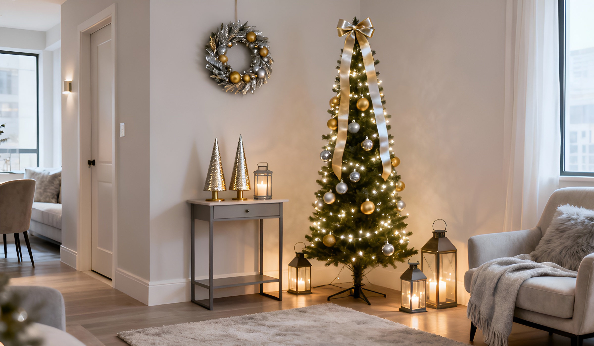 Создайте в доме уютный уголок зимнего настроения, чтобы в праздничный период наслаждаться спокойствием и приятной атмосферой Рождества дома. Отличным решением для новогоднего декора будет елка Лесная 220 см, украшенная игрушками стеклянными ручной работы «Недекорированная» Orbital 8 см золотистого цвета с полуглянцевым покрытием. Декор новогодний Бант BonaDi 821-317 26 см золотой металлик на верхушке дерева имеет нарядный и роскошный вид, добавляя праздничной торжественности интерьеру. Стеклянные фонарики разных размеров с большими свечами вокруг елки создают особую атмосферу, рассеивая загадочные тени поверхностью ламината Rezult Prestige PG203 Дуб Норвежский 32 класс 4-V 8 мм и светлых стен. Разместив рядом кресло Экми Мартин серого цвета с декоративной подушкой Bellus Deco Snugs 712 50*50 см, получим прекрасное место для отдыха после рабочего дня или вдохновенного утра с чашечкой любимого кофе.