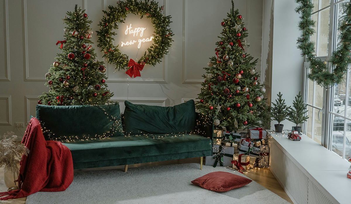 Рождественские колокольчики зовут окунуться в волшебный водоворот радости и чудес, подарков и неожиданностей, колядок и приятных встреч. Теплый, мягкий диван Мидас зеленый сочетает в себе комфорт и глубину изумрудного бархата, что успокаивает и уравновешивает. Пол с натуральной структурой древесины, которую выстилает ламинат Kronospan Super Natural Classic K485 Дуб Нейчрал Стерлинг 4V 8 мм, дарит приятный уют. Новогоднее настроение создают нарядные елки, украшенные набором елочных шаров BonaDi 147-587 8 см 12 шт красный/золотой. Елка Президентская литая 250 см сочетает красные и золотые цвета елочных игрушек стеклянных ручной работы «Д-215» Orbital 10 мм и новогодних бантов BonaDi J88-018 19*24 см красных. Хвойный декор дополняет новогодняя гирлянда хвойная Ковалевская литая 2,5 м, украшающая окно, а теплые огоньки желтого света подчеркивают изящную эстетику комнаты.