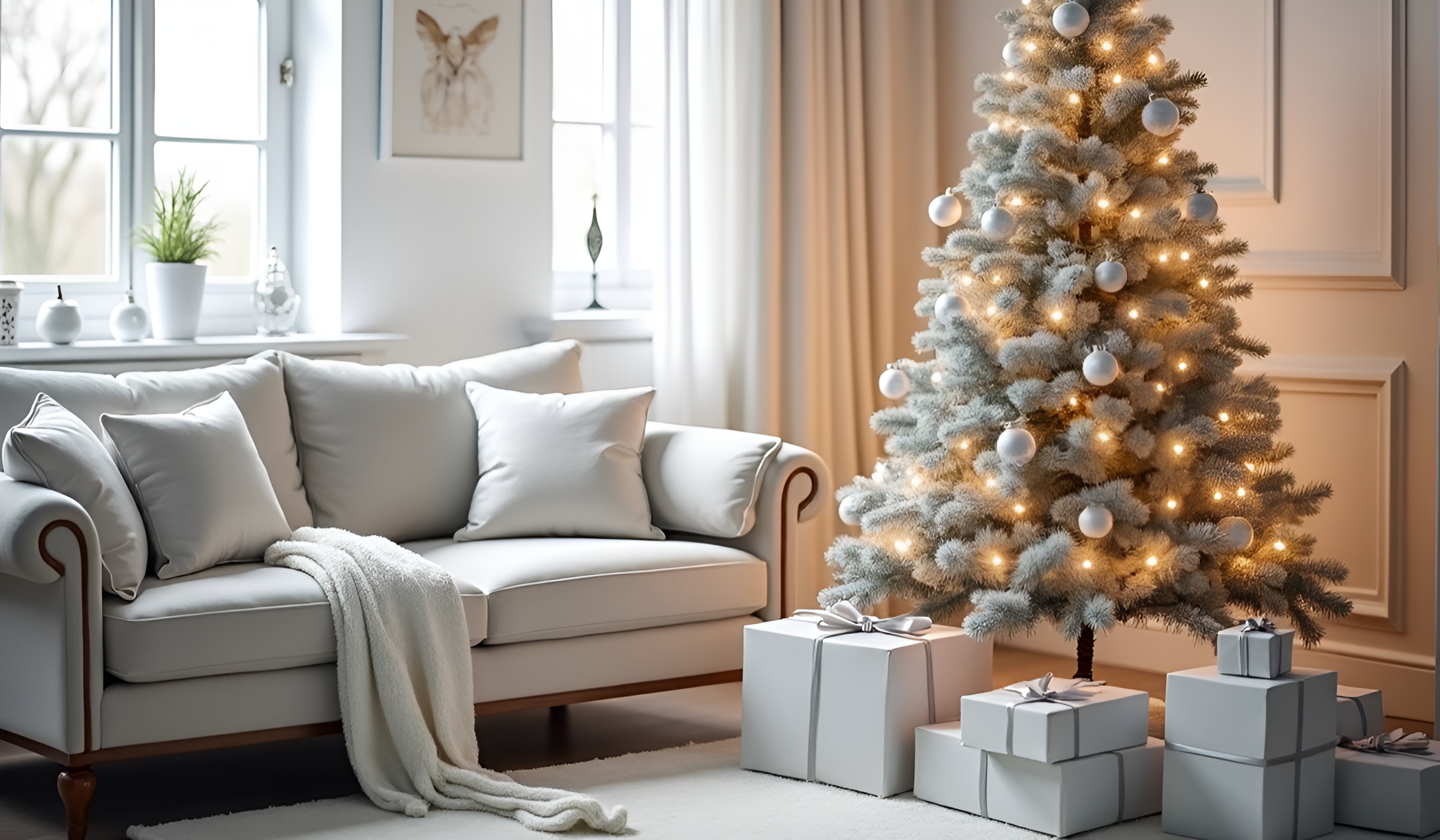 Праздничная гостиная зажгла нежные огоньки Рождества и приглашает в объятия тепла и семейного уюта. Под окном расположен диван Либерти молочный, манящий мягкими подушками и приятным комфортом пледа флисового Emily Manner Beige 94344448 200*220 см бежевого цвета. Здесь можно в полной мере насладиться тихим вечерним чтением или интересной беседой за чашечкой ароматного напитка. На страже праздничного уюта стоит елка Венская заснеженная 210 см, украшенная елочными игрушками стеклянными ручной работы «Недекорированная» Orbital 8 см белый опал и изящной гирляндой Delux Icicle С 100LED 3,2*0,7 м теплого белого света. На полу, отделанном ламинатом Kastamonu Floorpan Urban Tokyo FU006 32 класс 4V 8 мм, раскинулся пушистый белый ковер. Он придает спокойствие и приятные тактильные ощущения, а также изысканную элегантность интерьеру.