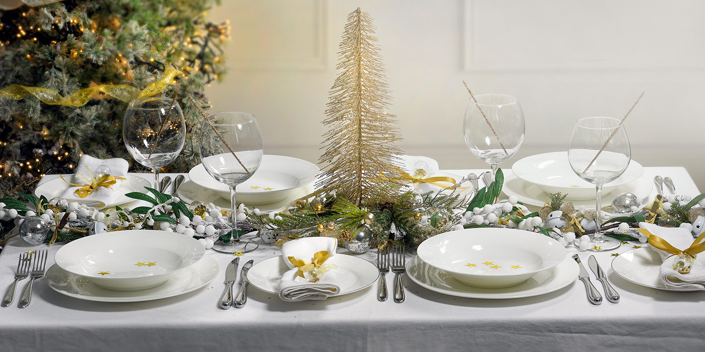 Сервировка новогоднего стола с тарелками Luminarc и бокалами Bohemia