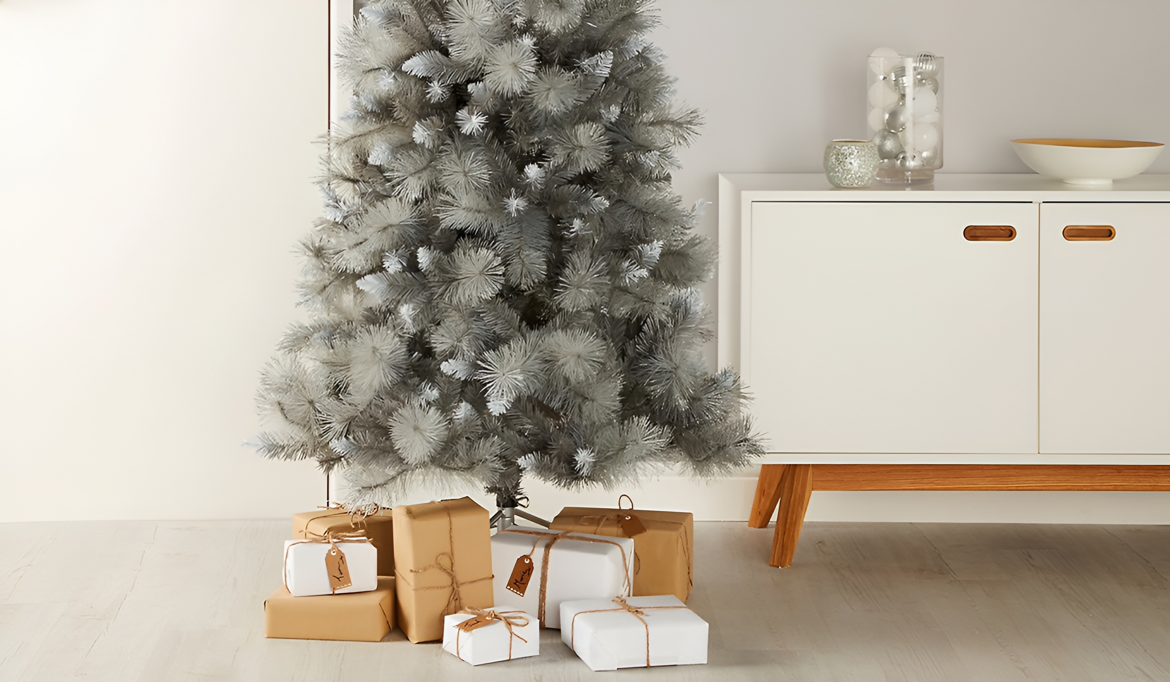 В зимний период холодов и длинных ночей хочется добавить тепла и праздничного настроения в наши дома. В комнате, что на фото, предвестником рождественских праздников и новогоднего настроения является елка Президентская заснеженная конусная 230 см с горой подарков от Николая. Она эффектно контрастирует на светлом полу, выложенном ламинатом AGT Luna Verona PRK1110 33 класс V4 8 мм. Лаконичный белый шкафчик на деревянных ножках стильно подчеркивает минимализм комнаты и эстетику четких форм. Ее украшает прозрачная ваза Trendglass Olav 35020 22,7 см с набором елочных шаров BonaDi 47-157 4 см 12 шт серебро и элегантная фруктовница Viva Edge Clear B100069 26,5*11 см. Праздничное украшение пространства не только добавляет особую атмосферу, но и подчеркивает стиль интерьера, сочетая четкие и совершенные его признаки.