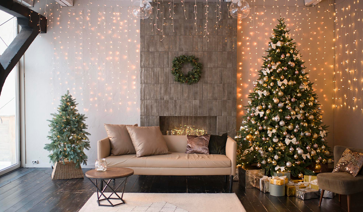 Магия новогодних праздников осеняет огоньками иллюминаций в просторной гостиной с импровизированным камином. Центральная аттракция - это, конечно, елка Венская литая 250 см, щедро украшенная набором елочных шаров BonaDi 147-344 40 шт. сверкающих нежной позолотой в ярком углу комнаты. Аккуратный диван DLS Дорз-3 темно-бежевый с декоративными подушками карамельных оттенков является уютным островком отдыха и спокойствия. Напротив разместился столик журнальный Aqua Rodos Линт D60*45 для удобства и комфорта. Кафельную стену над камином украшает венок декоративный Ковалевский Siga Group литой голубой. Светильник подвесной Nowodvorski Sphere XL 7846 черный свисает с потолка элегантным шаром и добавляет пространству света и невесомости. Возле елки разместилось кресло DLS Аква-1 коричневое с золотистой подушкой. Атмосферу магии и сказочного настроения создает гирлянда штора Lebron 15-18-79 320 LED 3*2 м желтого теплого света с мерцающим настроением зимних праздников.