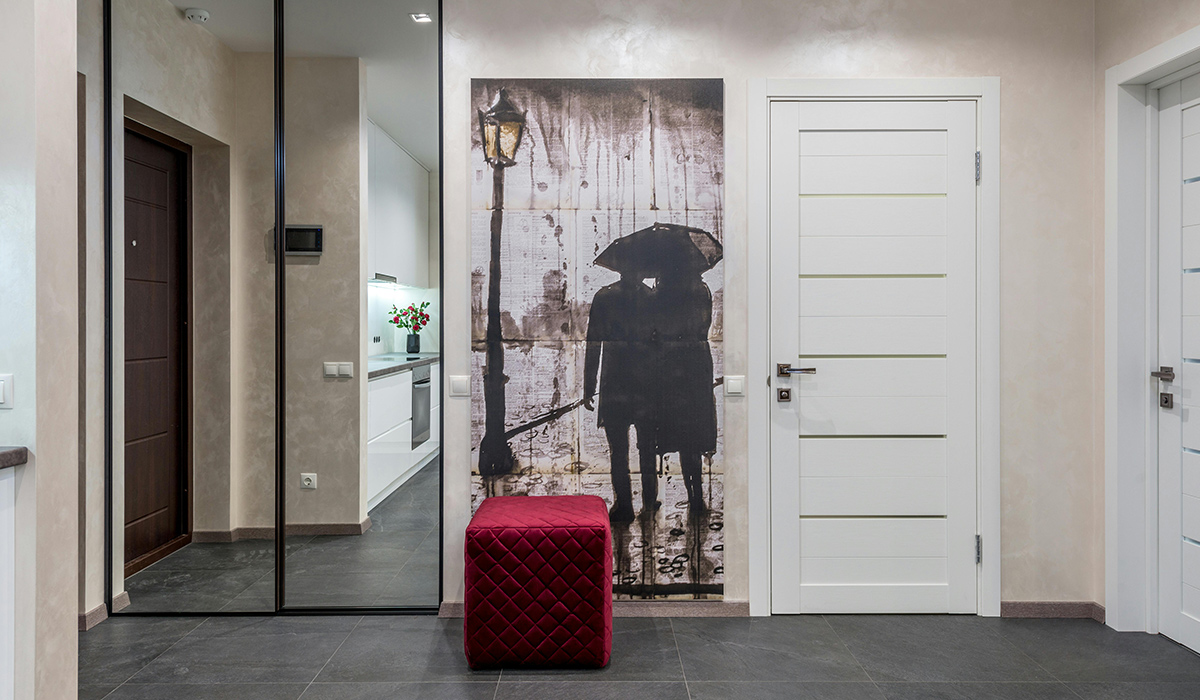 В уютной прихожей квартиры создано стильное и современное пространство, которое сочетает элегантность и функциональность. На полу видим керамогранит Cersanit Silver Heels graphite matt размером 59,8*59,8 см, который добавляет сдержанности и практичности. Стены оформлены с помощью декоративной краски Primacol Decorative Moonlight в золотой базе, что создает теплую и изысканную атмосферу, наполняя помещение мягким светом.