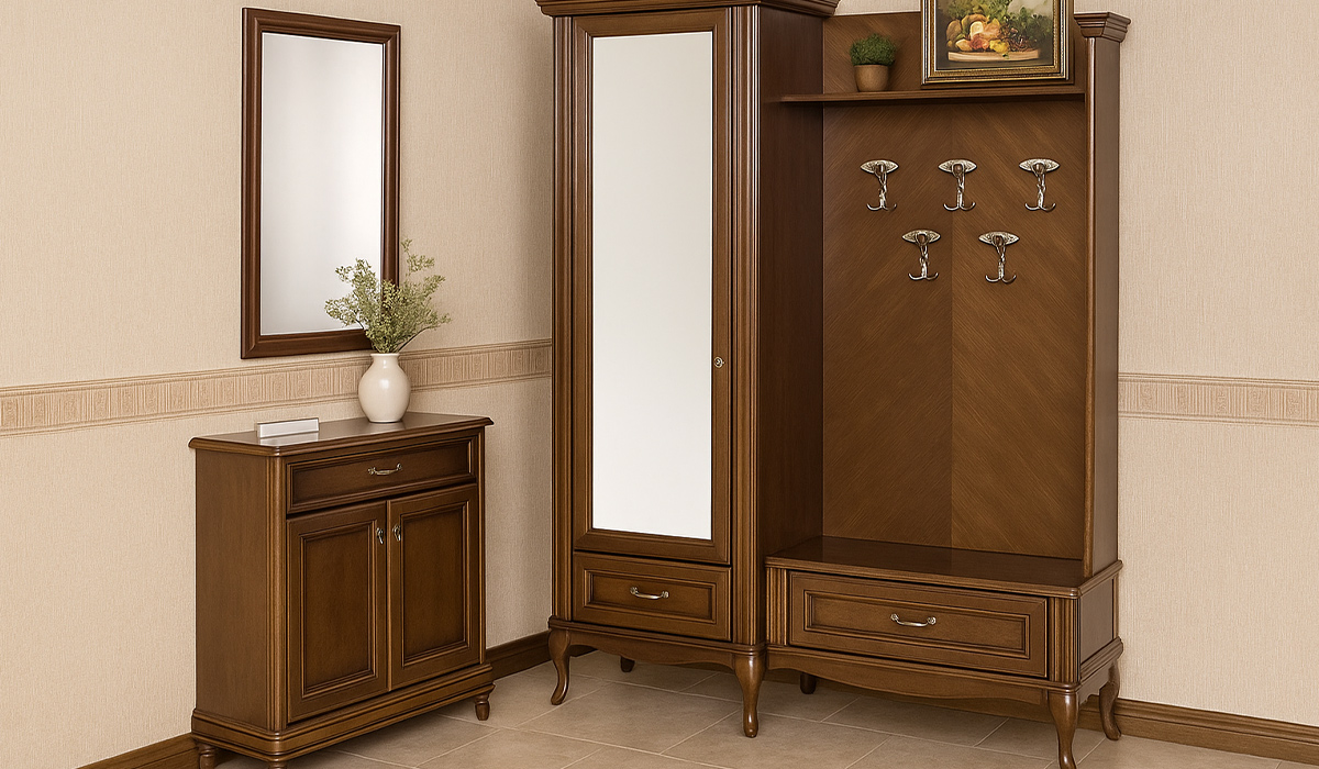 Классическая прихожая — это комфорт и уют на долгие годы. Она создает приятную домашнюю атмосферу и демонстрирует изысканный вкус ее владельцев. Комната, представленная на фото, согревает теплыми оттенками керамогранита Cersanit Tanos 1с 29,8*29,8 бежевого цвета и виниловых обоев Grandeco Universe 4 UR2007, которые составляют элегантный фон для глубокого темного цвета мебели. Деревянная прихожая Амальтея коньяк является настоящим украшением комнаты. Богатство природного материала вместе с изысканностью цвета и четкостью форм создают идеальное эстетическое сочетание. Фигурные крючки, большие выдвижные ящики, просторный шкаф с зеркалом обеспечивают функциональное пространство, где удобно раздеваться, придя с улицы. Стилистику мебели продолжает красивый плинтус MARCO decor SPC 7915-122 дуб золотой 79*2900 мм и изящная рама зеркала Merx Moderno МН400 26008829 орех. Живописная картина с изображением натюрморта ярко подчеркивает стиль комнаты и создает красочный акцент интерьера.