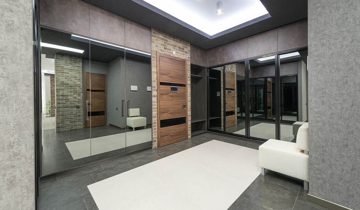Элегантная прихожая предлагает удивительную игру зеркал в продолжении пространства. Плитка Golden Tile Kendal графит У1Ф659 30,7*60,7 на полу вместе с жидкими обоями Yurski Бегония 122 1 кг серого цвета создают эффектное обрамление, напоминающее прочность натурального камня. Гармонию темных тонов дополняет Плинтус MARCO decor SPC 8012-701 серый 80*2900 мм. Светлый прямоугольник пола рисует яркий акцент, умножается в отражениях светильников и повторяется в дизайне потолка, мягко подсвеченного светильниками точечными поворотными Feron ML304 белого цвета. Клинкерная плитка Cerrad Loft Brick masala 24,5*6,5 см коричневая дополняет теплоту древесных оттенков дверей и визуально расширяет их размеры. Контрасты света и темноты создали лучшую картину в отделке этого изысканного коридора.